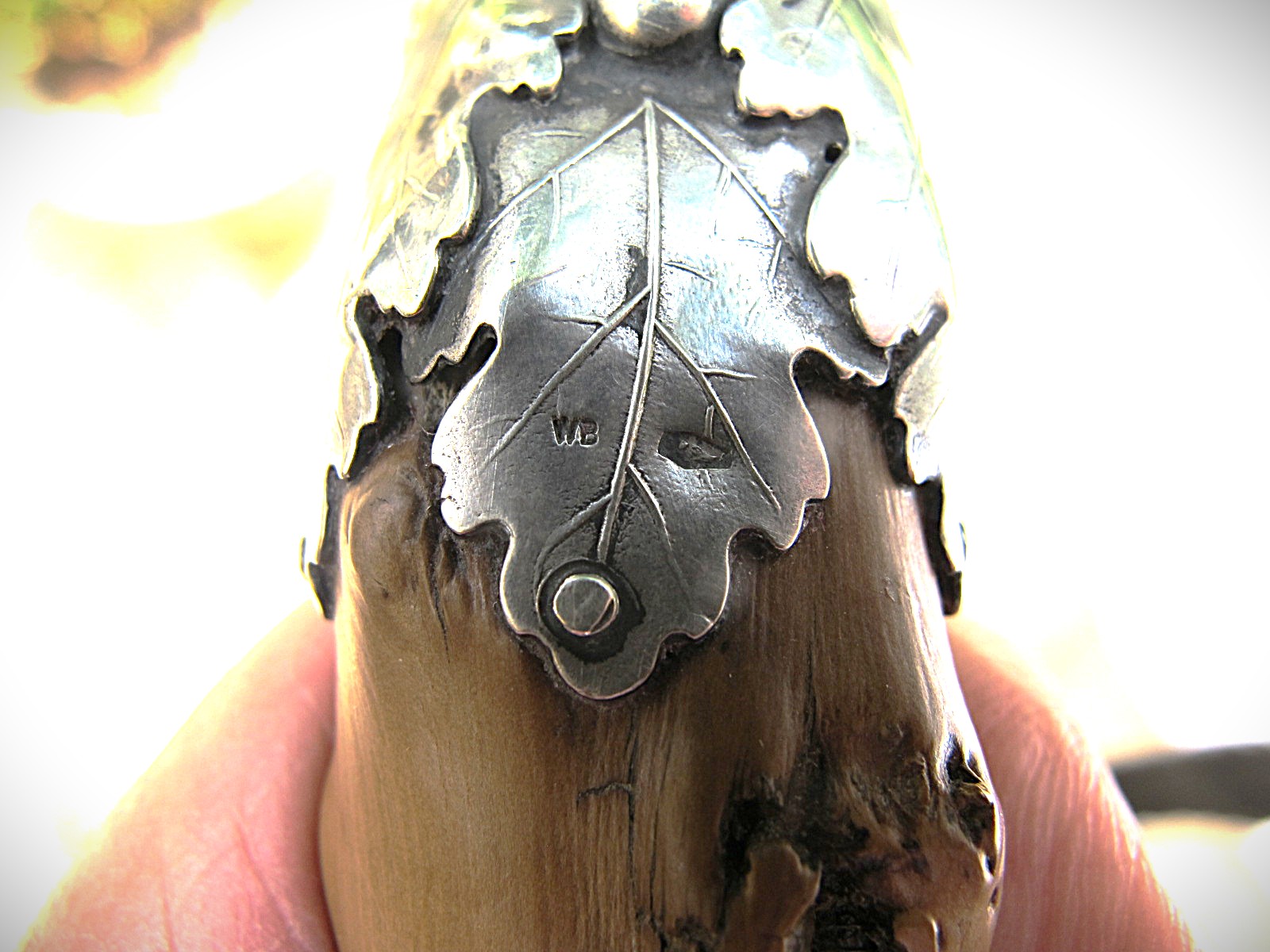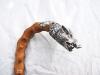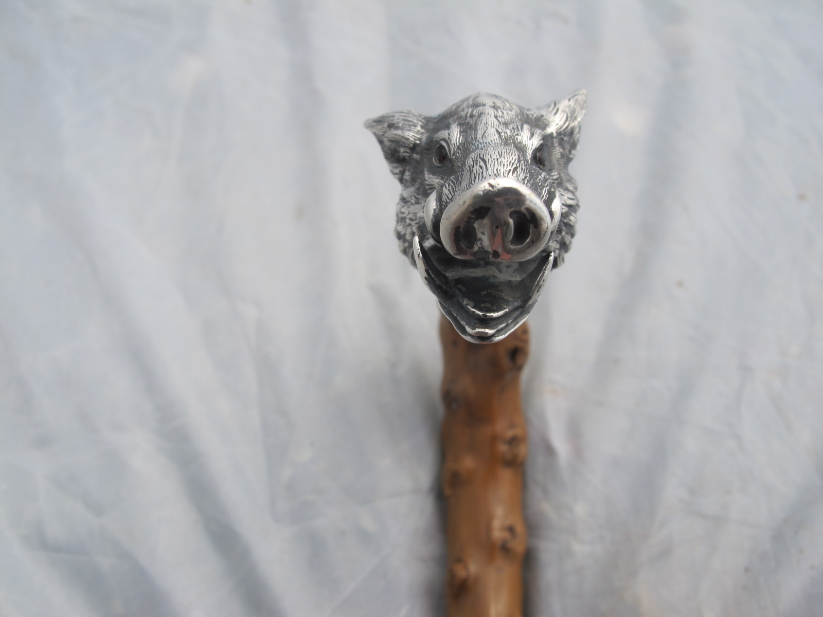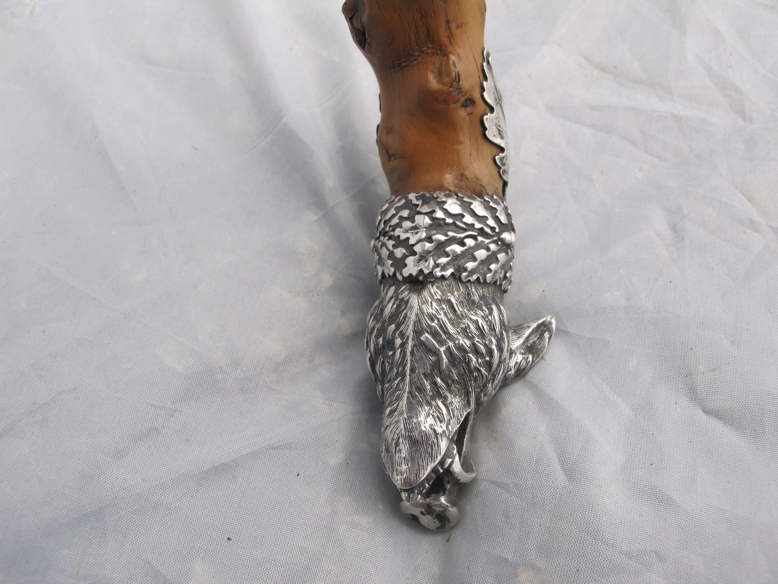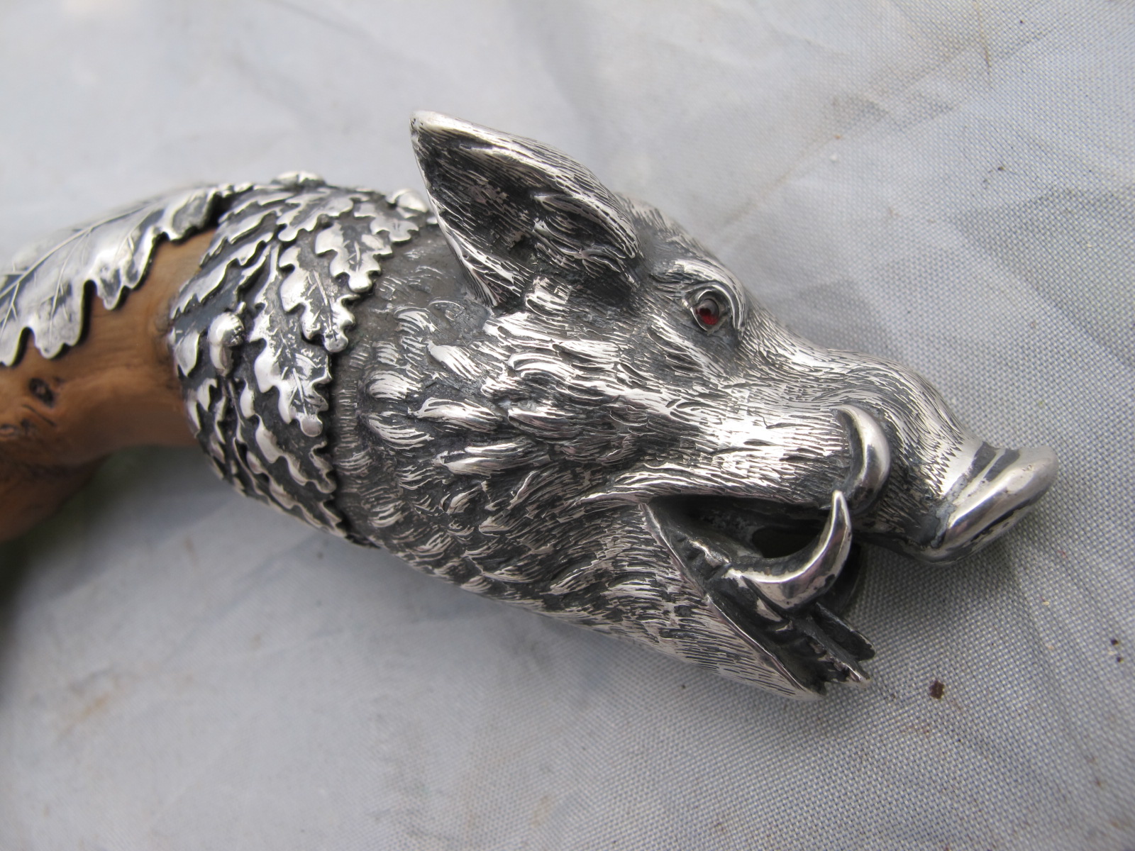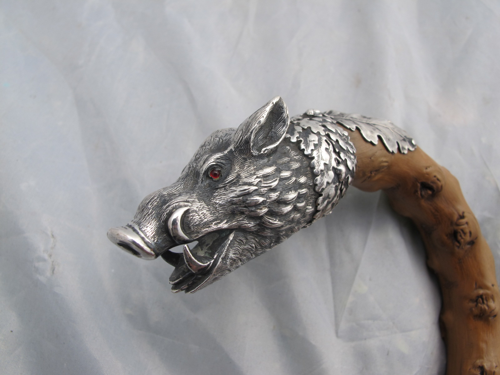FRENCH STERLING SILVER BOARS HEAD WALKING STICK WITH OAK LEAVES & RUBY EYES. C1860'S |